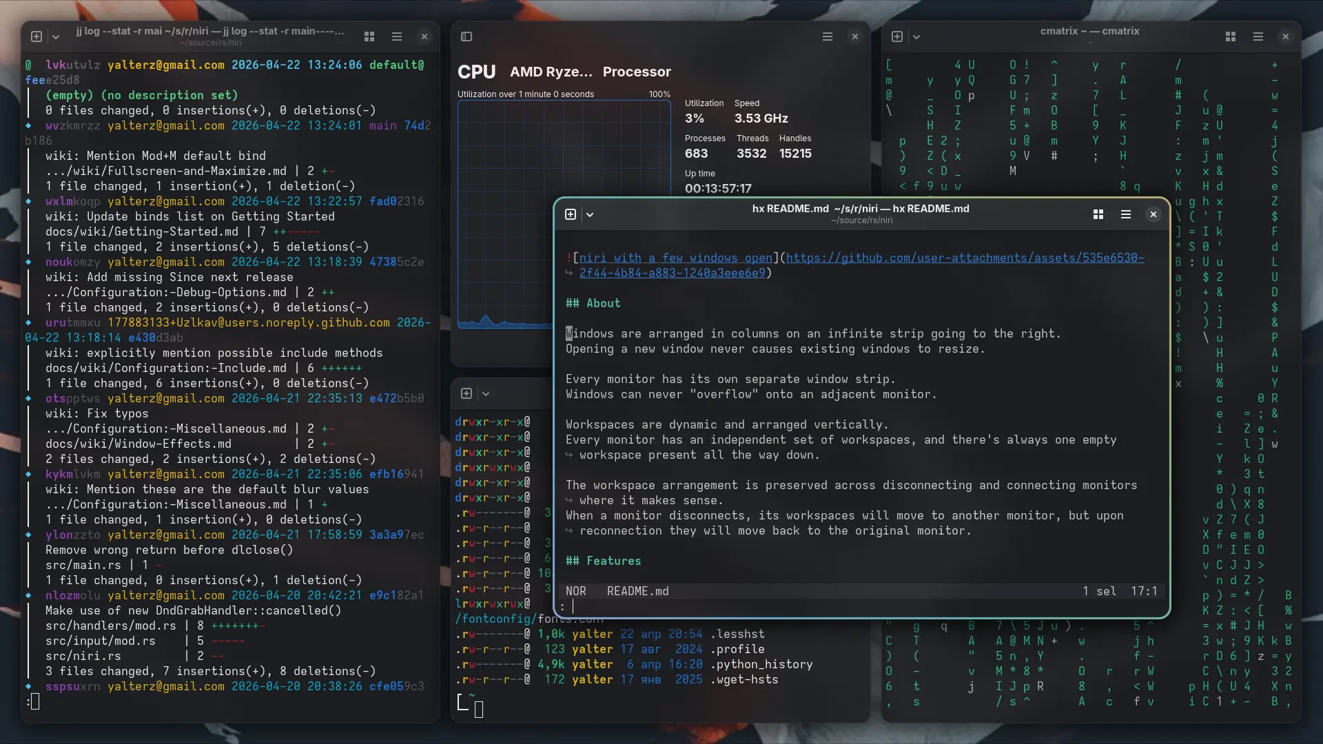 निरी हे लिनक्ससाठी सर्वात वेगाने वाढणाऱ्या विंडो व्यवस्थापकांपैकी एक आहे (तांत्रिकदृष्ट्या वेलँड कंपोझिटर). अनंत क्षैतिज रिबन हे त्याला विशेष बनवते. जेव्हा तुम्ही ॲप उघडता आणि नंतर दुसरी विंडो उघडता तेव्हा ते उजवीकडे उगवते. तिसरी उघडल्यावर, पहिली विंडो इतरांचा आकार न बदलता स्क्रीनवरून स्क्रोल होते. तुम्ही कीबोर्ड शॉर्टकट किंवा टचपॅड जेश्चर वापरून डावीकडे किंवा उजवीकडे स्क्रोल करून उघडलेल्या अनुप्रयोगांच्या या अंतहीन पंक्तीमधून नेव्हिगेट करता.