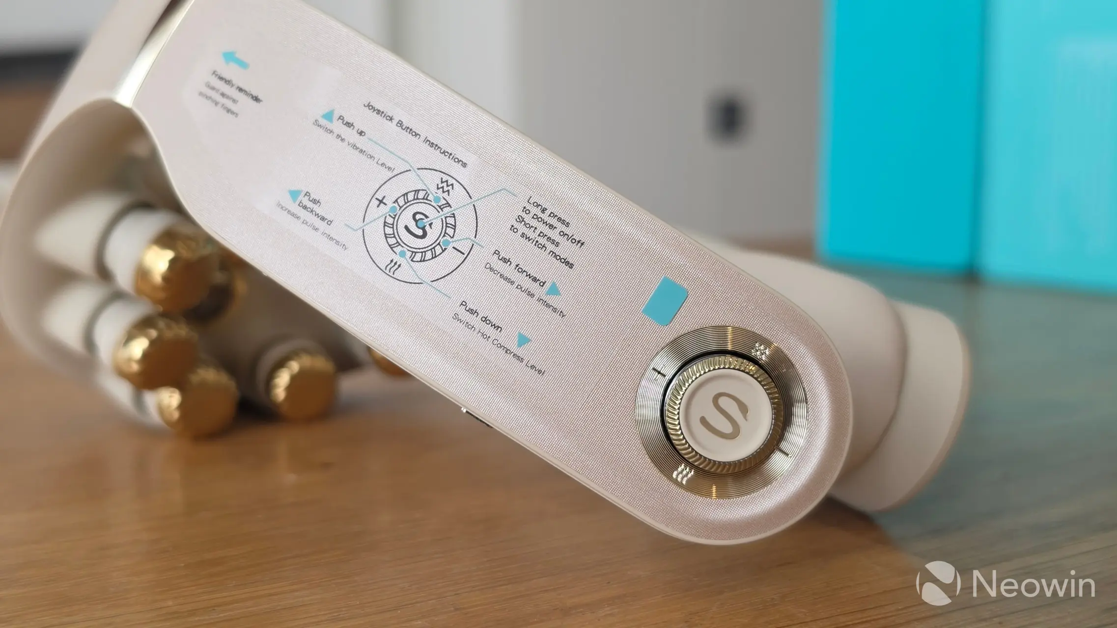 नेक मसाजरच्या उजवीकडे ऑन/ऑफ आणि मोड्स बटण आहे जे जॉयस्टिक म्हणून देखील कार्य करते, तुम्ही सर्व मोड्स थेट पॉवर बटणावरून ऑपरेट करू शकता, तसेच ॲप जे मी थोड्या वेळाने पाहू: