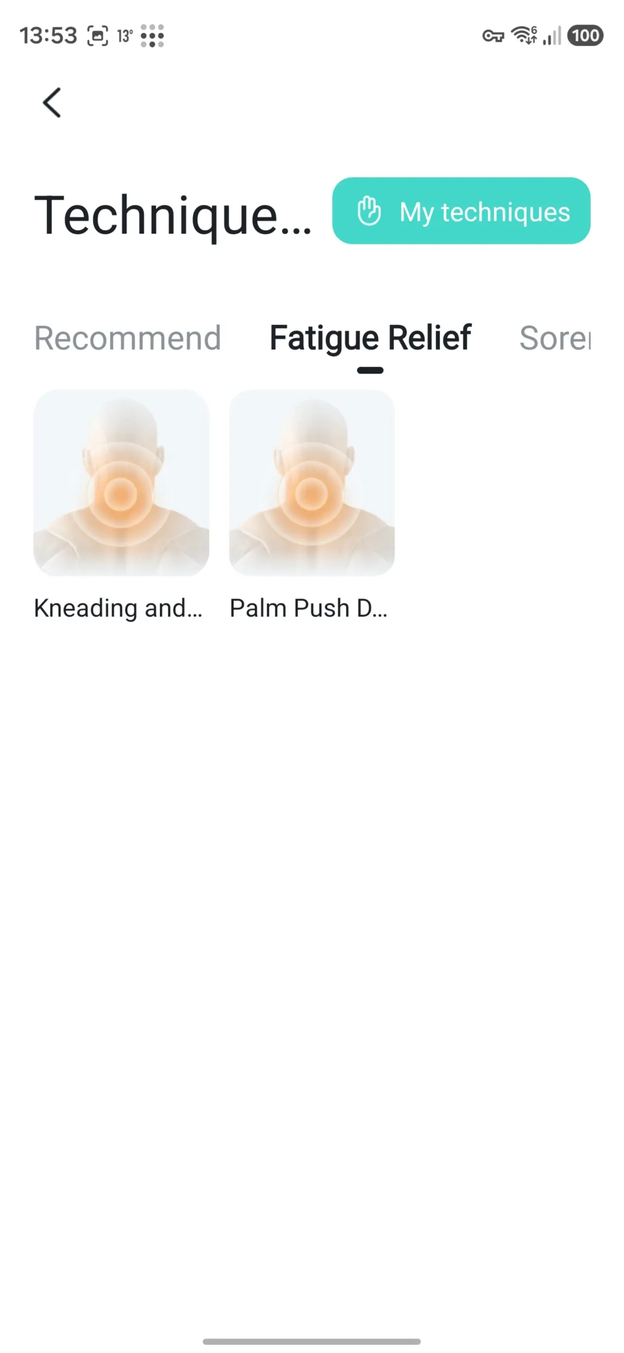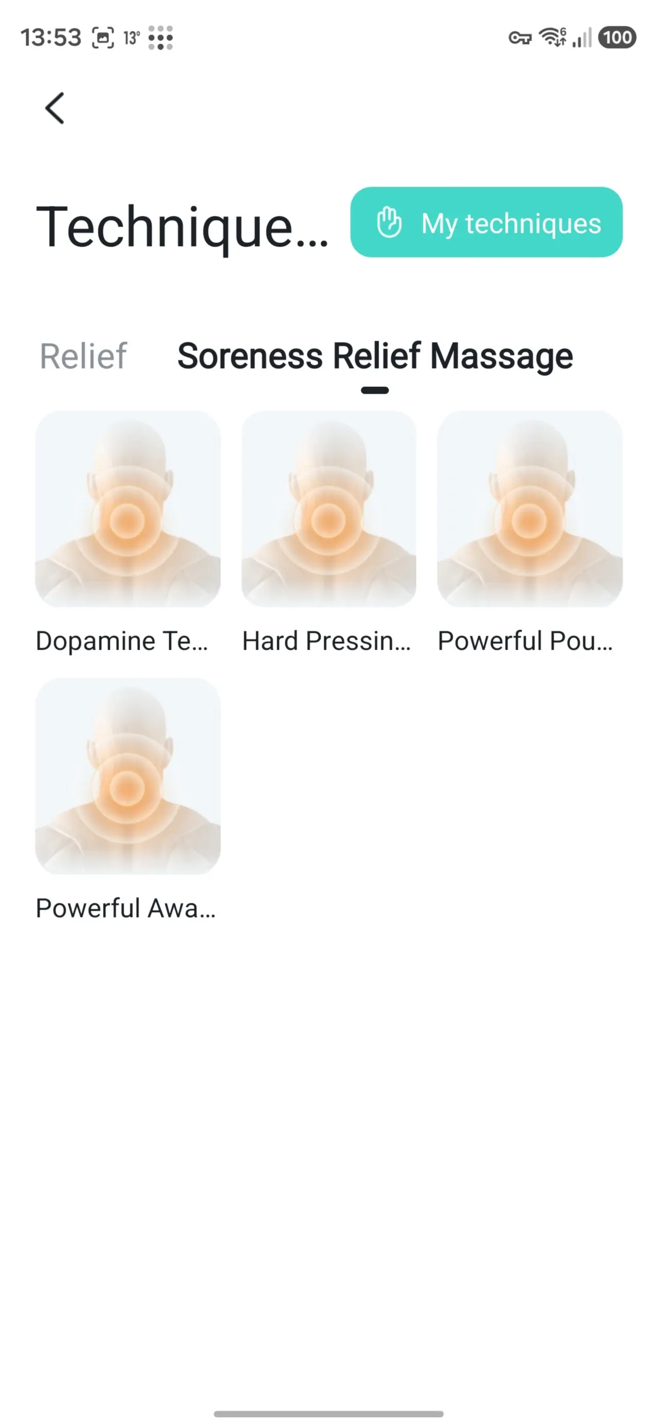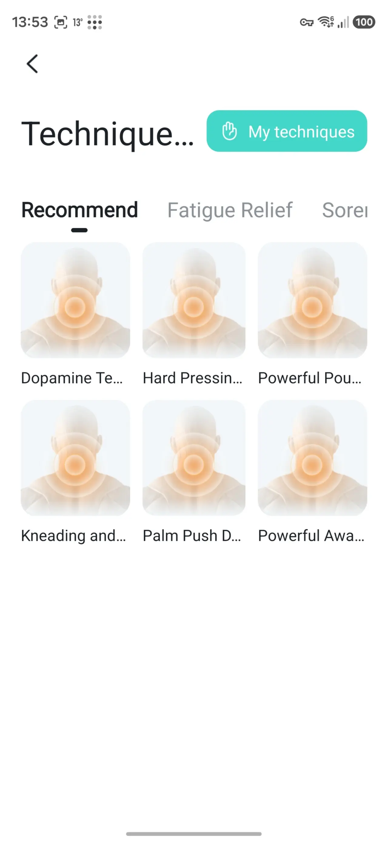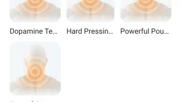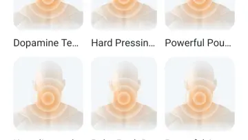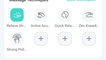 अधिक तंत्रांवर टॅप केल्यावर, मुख्य ॲप स्क्रीन “मसाज तंत्र” वर इतर मोडचा एक समूह जोडला जाऊ शकतो, सर्व मोडची नावे कापली जातात.