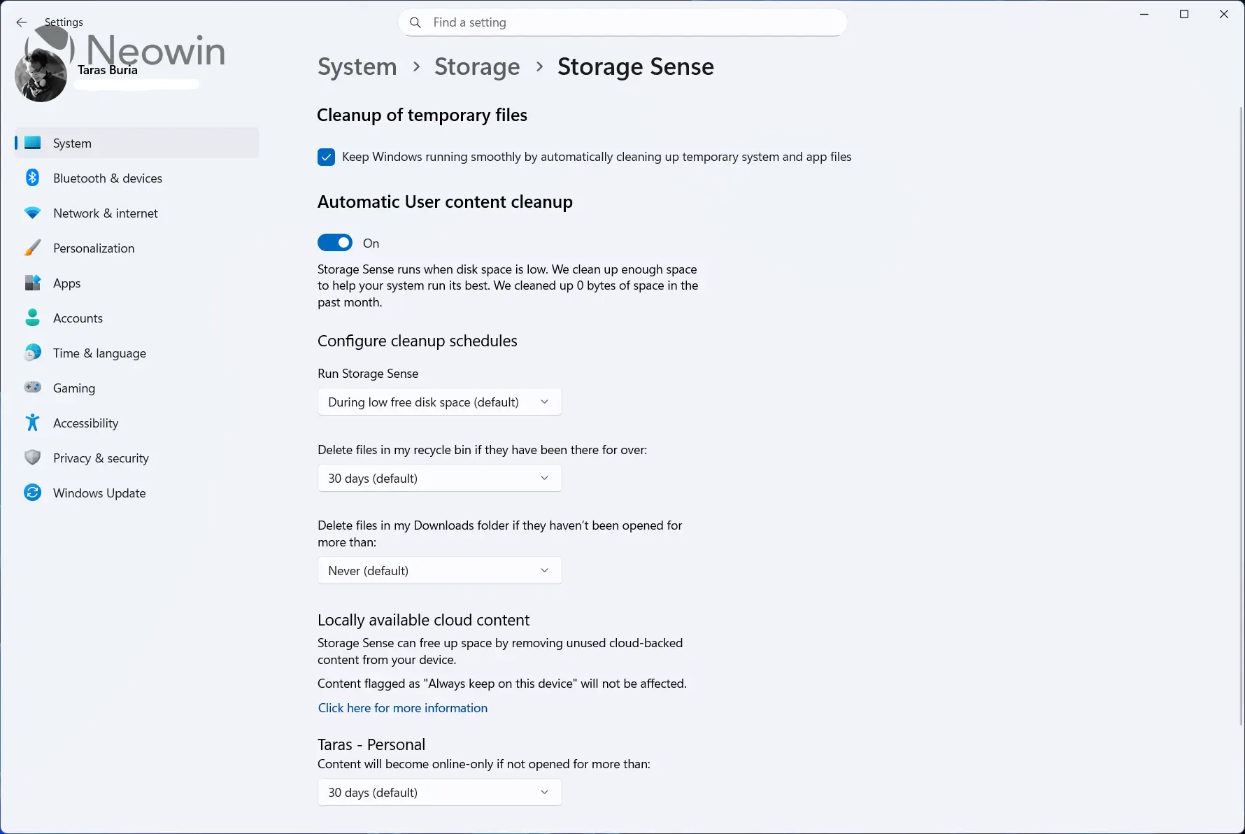प्रथम, आमच्याकडे स्टोरेज सेन्स आहे जो तुमच्या रीसायकल बिनमधील तात्पुरत्या फाइल्स आणि वस्तूंसारख्या तुम्हाला यापुढे आवश्यक नसलेल्या वस्तूंपासून मुक्त करून सिस्टम ड्राइव्ह (विंडोज इंस्टॉलेशन ड्राइव्ह किंवा C:) जागा स्वयंचलितपणे मुक्त करतो. सामान्यतः, सेटिंग Windows 10/11 वर डीफॉल्टनुसार सक्षम केलेली नसते; तुम्ही सेटिंग्ज > सिस्टम > स्टोरेजला भेट देऊन ते तपासू शकता आणि चालू करू शकता आणि स्टोरेज सेन्स आधीपासून नसल्यास “चालू” वर टॉगल करू शकता.