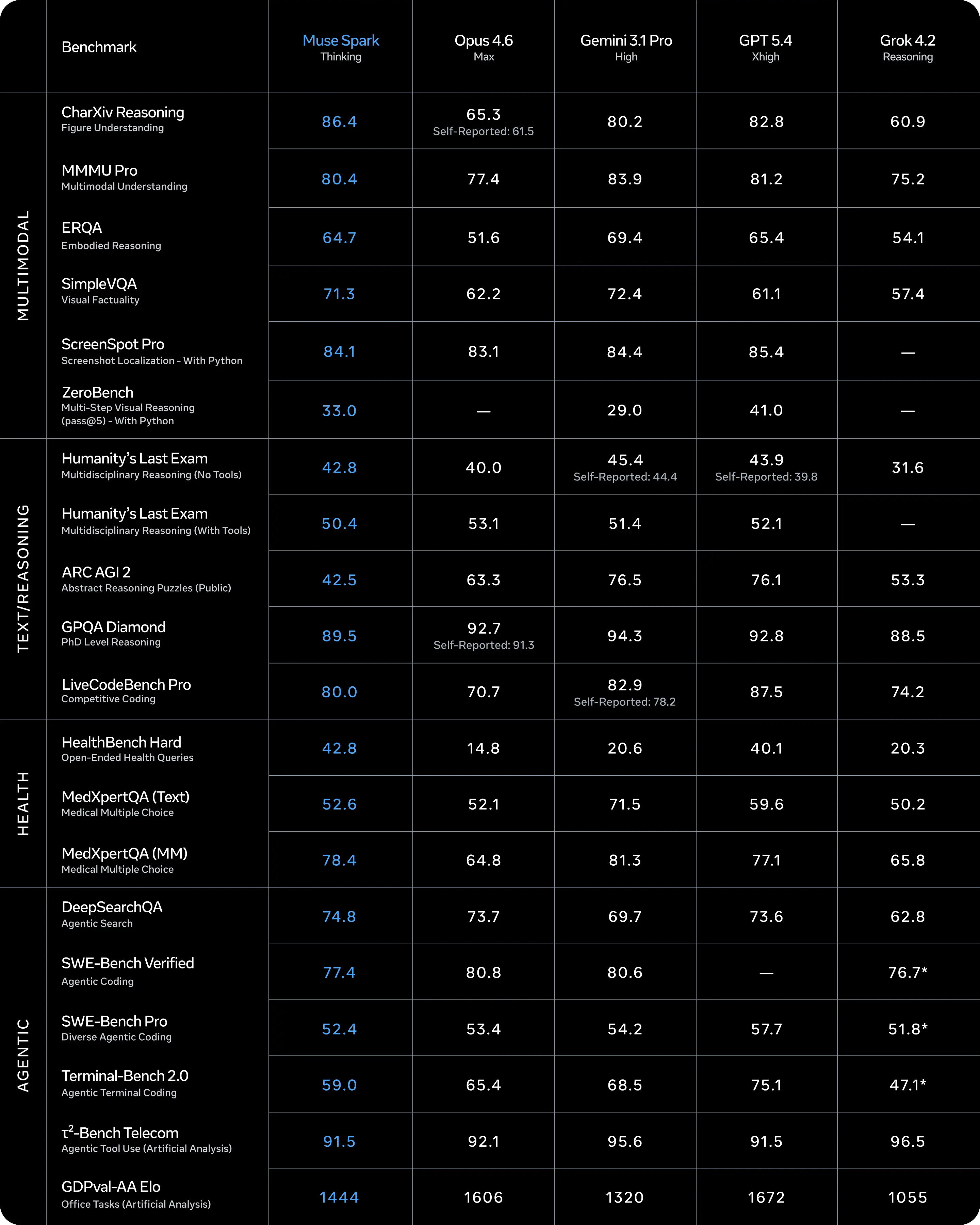 Opus 4.6 Max च्या तुलनेत Muse Spark (Thinking) स्पर्धात्मक परिणाम देते, मिथुन ३.१ प्रो उच्च, GPT 5.4 Xhigh, आणि Grok 4.2 तर्क. मेटा म्हणते की मल्टीमॉडल समज, तर्क, आरोग्य आणि एजंटिक कार्यांमध्ये ते खूप सक्षम आहे, तथापि, दीर्घ-क्षितिज एजंटिक प्रणाली आणि कोडिंग वर्कफ्लोमधील कार्यप्रदर्शनातील अंतर मान्य केले आहे. तथापि, ही तफावत बंद करण्याचा प्रयत्न करण्यासाठी गुंतवणूक केली जात आहे.