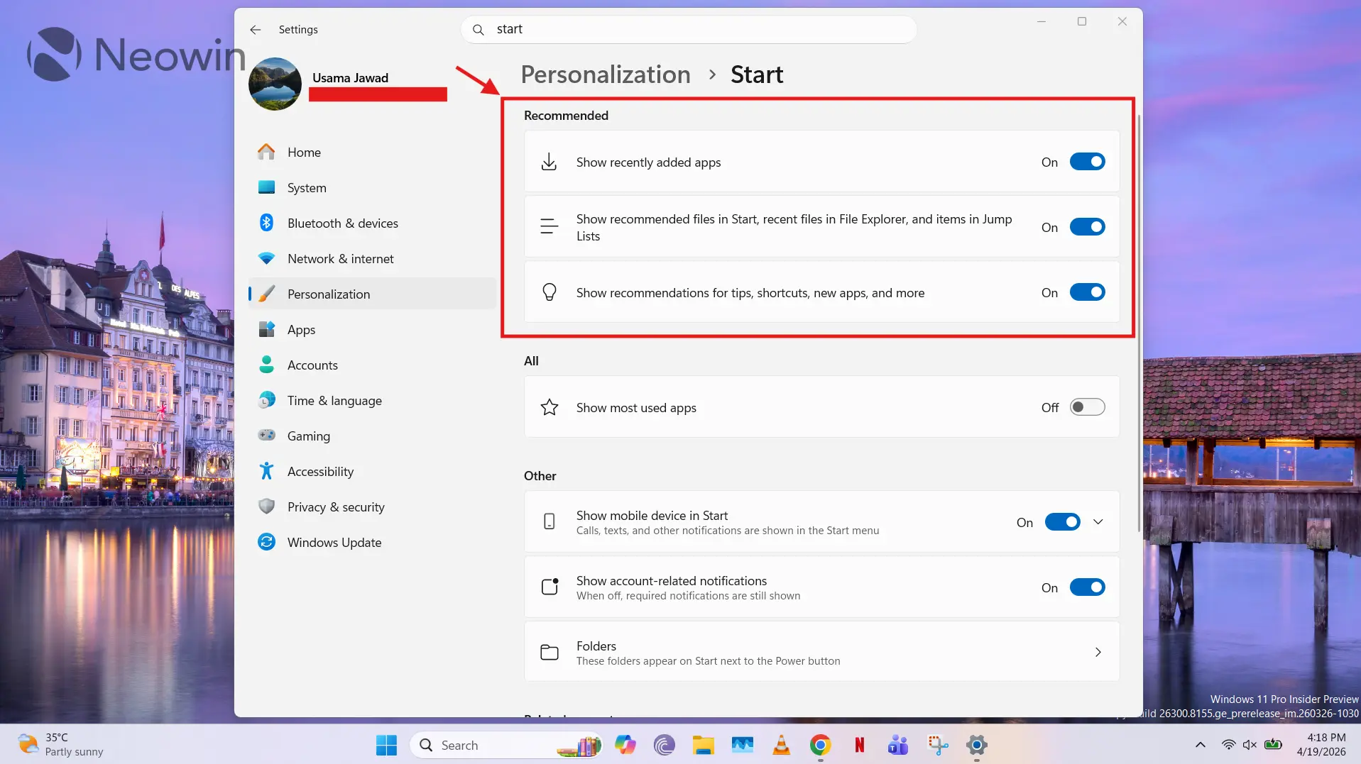 1 – प्रारंभ मेनू शिफारसी बंद करा
