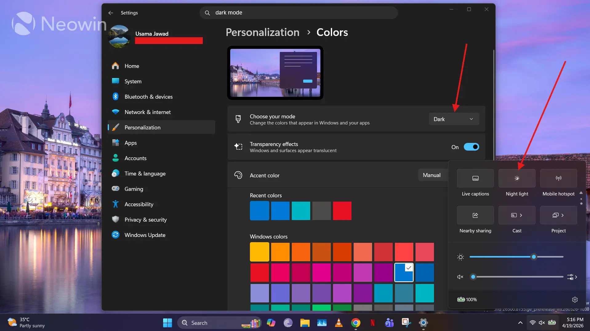 काही लोक चमकदार डिस्प्लेमुळे आंधळे होण्याचे खरोखर कौतुक करत नाहीत, विशेषतः कमी-प्रकाश वातावरणात काम करताना. तुमच्या डिस्प्लेची ब्राइटनेस मॅन्युअली कमी करण्याचा एक पर्याय असल्यास, आणखी काही इच्छनीय कॉन्फिगरेशन अंतर्भूत आहेत. यामध्ये डार्क मोड सक्षम करणे समाविष्ट आहे सेटिंग्ज > वैयक्तिकरण > रंगआणि दुसऱ्यासाठी तुम्ही टास्कबारवरून नाईट लाइट चालू करणे आवश्यक आहे. पूर्वीचे दुर्दैवाने शेड्यूलिंग यंत्रणा ऑफर करत नाही, परंतु आपण ते द्वारे सक्षम करू शकता लाइट स्विच पॉवर टॉय. तुम्ही या दोन क्षमतांचा एकत्र वापर देखील करू शकता. गडद मोड देखील मस्त दिसतो तर नाईट लाइट निळ्या प्रकाशापासून मुक्त होऊन डोळ्यांचा ताण कमी करू शकतो.