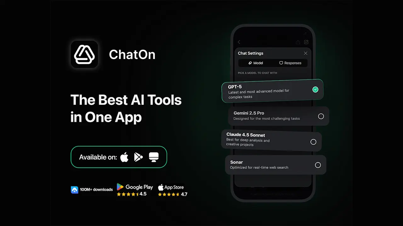 ChatOn हे सर्वात लोकप्रिय AI चॅटबॉट्सपैकी एक आहे, ज्यामध्ये iOS आणि Android वर 100M डाउनलोड आहेत—तसेच ते वेबवर देखील उपलब्ध आहे. लोकांना लिहिणे, संशोधन करणे, योजना आखणे, संघटित करणे आणि निर्णय घेण्यास मदत करणे यासारख्या दैनंदिन कामांसाठी हे सर्व-इन-वन एआय टूलबॉक्स आहे, जेणेकरून ते दैनंदिन कामे जलद आणि अधिक कार्यक्षमतेने हाताळू शकतील. एकाच प्लॅटफॉर्ममध्ये अनेक क्षमता आणून, ChatOn अनेक सबस्क्रिप्शनची गरज काढून टाकते. ॲप एकाच ठिकाणी अनेक अग्रगण्य AI मॉडेल्समध्ये प्रवेश प्रदान करते, ज्यामुळे वापरकर्त्यांना प्लॅटफॉर्म स्विच न करता लेखन, संशोधन, तर्क किंवा सर्जनशील कार्यांसाठी सर्वात योग्य मॉडेल निवडण्याची परवानगी मिळते.