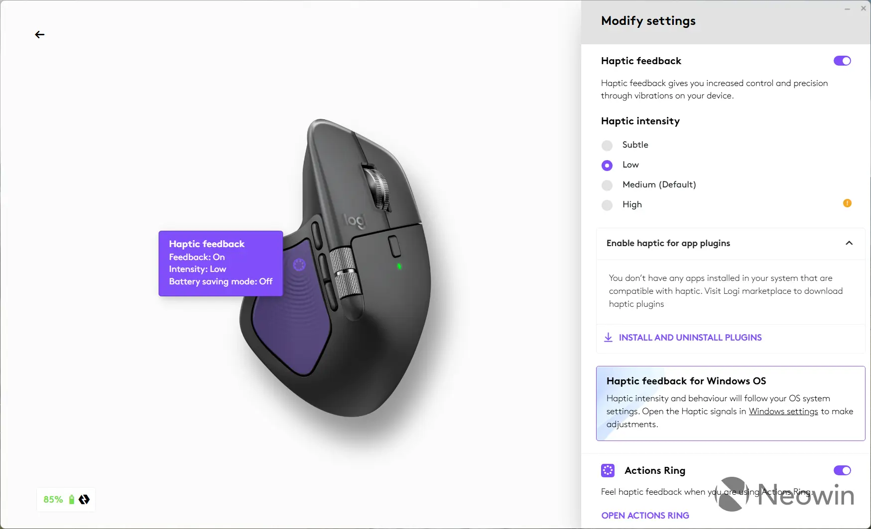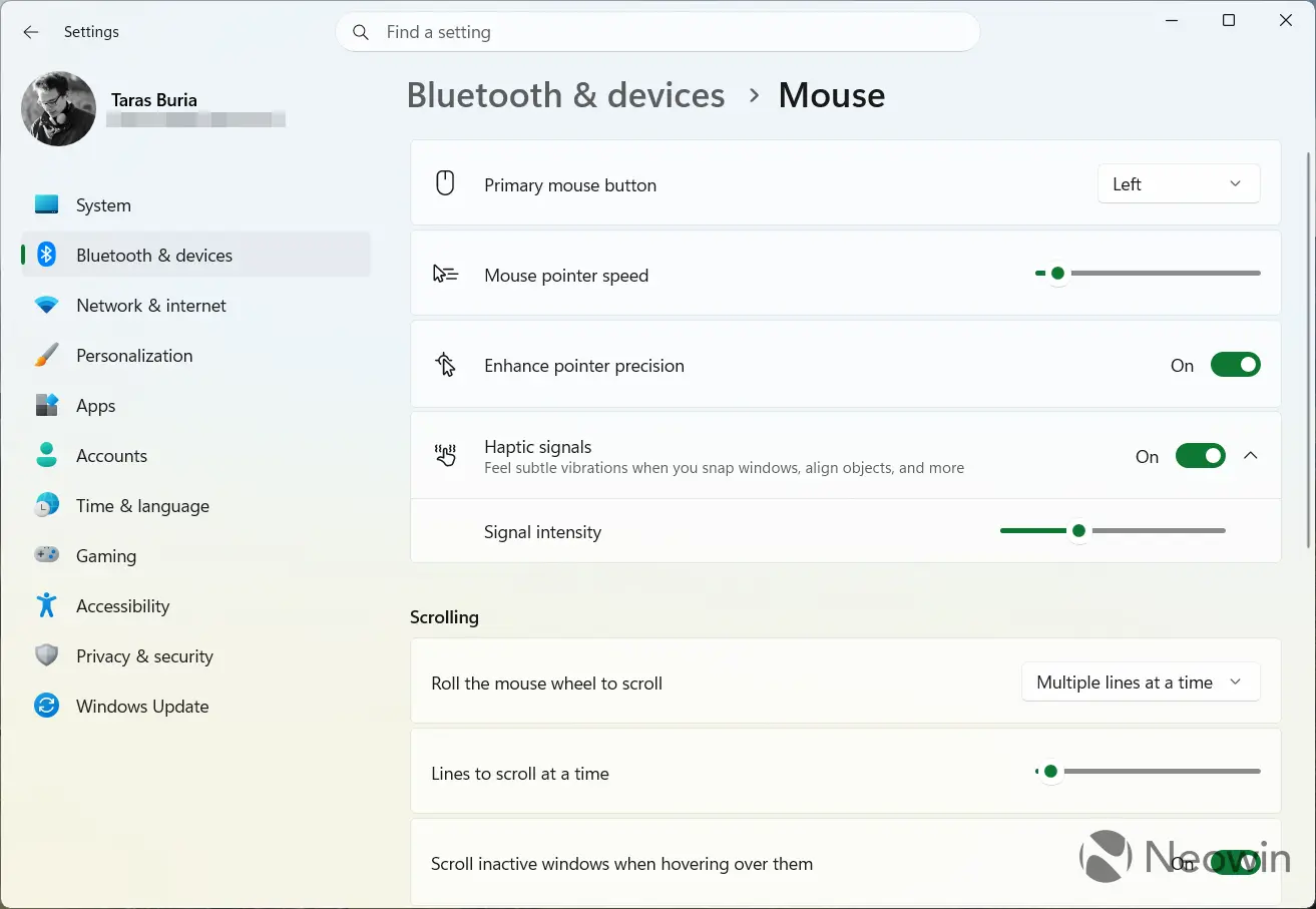 तथापि, जेव्हा मी माझा MX मास्टर 4 नवीनतम Dev बिल्ड असलेल्या सिस्टमशी कनेक्ट केला आणि ViVeTool ॲपसह हॅप्टिक सिग्नल सक्षम केले, तेव्हा टॉगल आणि तीव्रता स्लाइडर दिसू लागले, ज्यामुळे मला सेटिंग्ज ॲपमध्ये माऊसमध्ये हॅप्टिक फीडबॅक नियंत्रित करता आला. हे काम करत आहे! हे काम करत आहे!