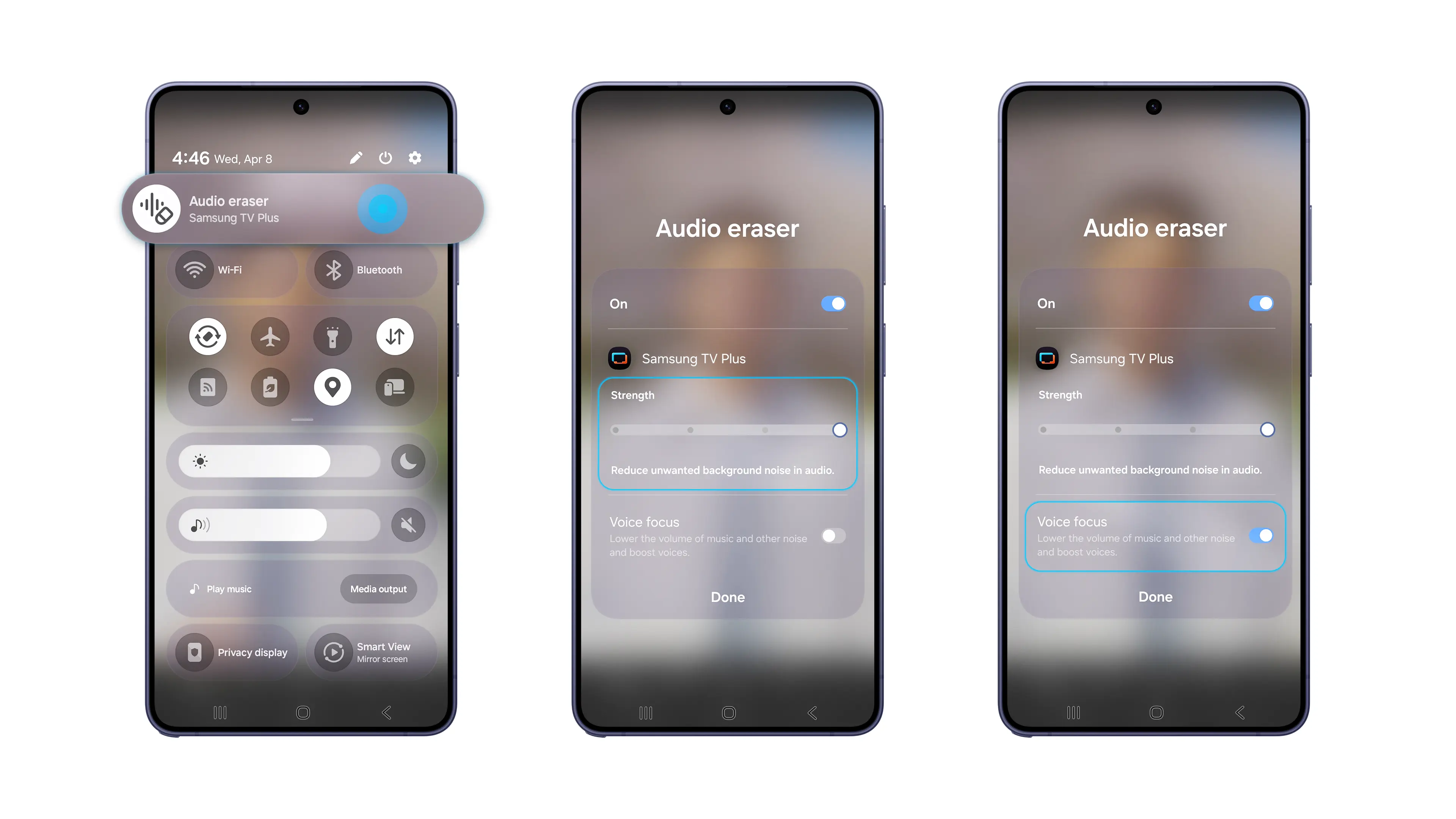 सॅमसंगने वापराच्या सुलभतेवरही लक्ष केंद्रित केले आहे; आशय प्ले होत असताना ऑडिओ इरेजर थेट क्विक पॅनलमधून ऍक्सेस केला जाऊ शकतो, विराम देण्याची किंवा रिवाइंड करण्याची गरज नाहीशी करून. एकदा सक्रिय केल्यावर, वापरकर्ते ऐकण्याच्या अनुभवाला छान-ट्यून करण्यासाठी डिझाइन केलेल्या नियंत्रणांच्या श्रेणीमध्ये प्रवेश मिळवतात. यामध्ये आवाज कमी करण्याची पातळी समायोजित करण्यासाठी स्ट्रेंथ स्लाइडर आणि संवादाची स्पष्टता वाढविणारा व्हॉइस फोकस पर्याय समाविष्ट आहे. प्लेबॅकमध्ये व्यत्यय न आणता सर्व समायोजन रिअल टाइममध्ये केले जाऊ शकतात.