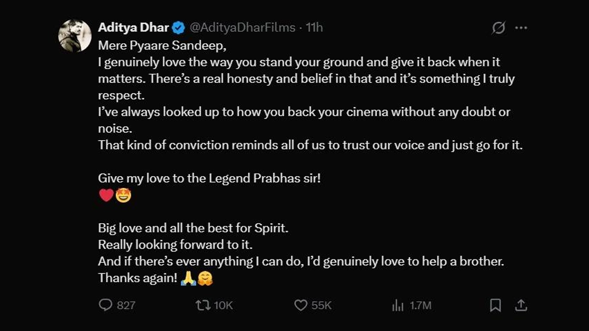 आदित्य धर यांचे उत्तर परस्पर आदराने भरलेले होते, टीकेला तोंड देताना वांगाची प्रतिष्ठा मान्य केली नाही. “मेरे प्यारे संदीप, तुम्ही ज्या पद्धतीने उभे राहता आणि जेव्हा महत्त्वाचे असेल तेव्हा ते परत देता ते मला मनापासून आवडते. त्यामध्ये खरा प्रामाणिकपणा आणि विश्वास आहे आणि मी खरोखरच आदर करतो,” धर यांनी लिहिले. आदित्य धर यांनी देखील संदीप रेड्डी वंगा यांच्या आगामी मेगा-प्रोजेक्टला पाठिंबा दर्शविला आत्मा आणि त्याचा मुख्य अभिनेता प्रभास, चित्रपट निर्मात्याशी एकता व्यक्त करतो. त्याच्या संदेशात धर यांनी लिहिले की, “मी काही करू शकत असल्यास, मला भावाला मदत करायला मनापासून आवडेल,” तसेच प्रभासचा एक “दंतकथा” म्हणून उल्लेख केला आणि चित्रपटाच्या अपेक्षित 2027 च्या रिलीजसाठी संपूर्ण टीमला शुभेच्छा दिल्या. ‘धुरंधर 2’ कायदेशीर अडचण: दिल्ली उच्च न्यायालयाने रणवीर सिंगच्या ‘ओये ओये’ गाण्याच्या कॉपीराइट विवादात त्रिमूर्ती फिल्म्समध्ये मध्यस्थी करण्याचे आदेश दिले आहेत.