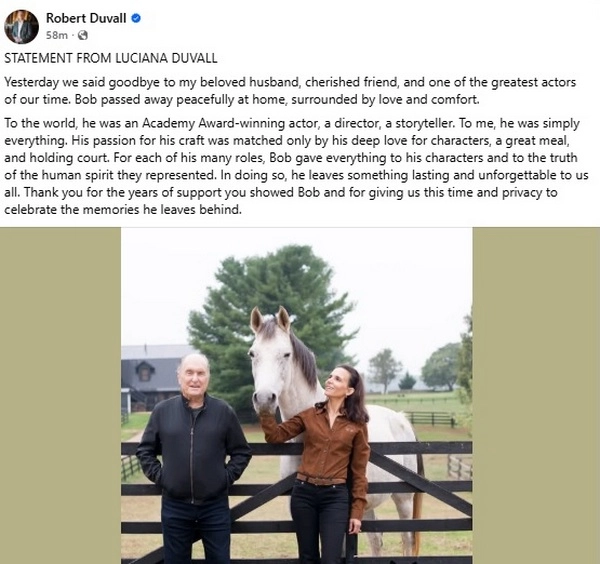 लुसियाना डुव्हलने रॉबर्ट ड्युव्हलच्या फेसबुक पेजवर त्याच्या मृत्यूबद्दल विधान पोस्ट केले (फोटो क्रेडिट; @RobertDuvallOfficial/Facebook)