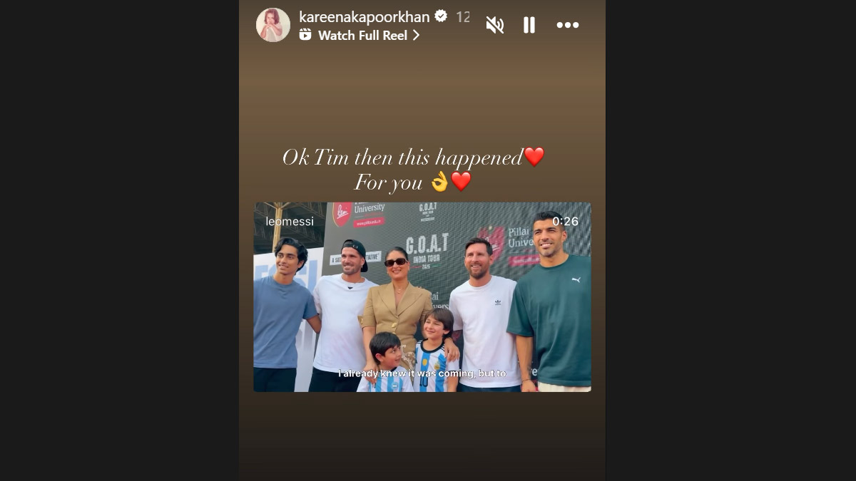करिनाने तिच्या इंस्टाग्रामच्या स्टोरीज सेक्शनवर मेस्सीचा व्हिडिओ पुन्हा पोस्ट केला आणि लिहिले, “ओके टिम मग हे घडले (हार्ट इमोजी) तुझ्यासाठी (हार्ट इमोजी) (sic).”