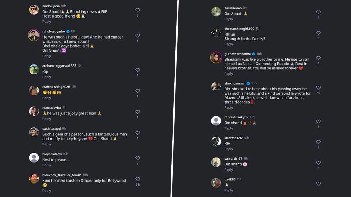 अभिनेते शेखर सुमन, गायक राहुल वैद्य आणि टेलिव्हिजन निर्माते मनीष गोस्वामी यांनी अधिकाऱ्याला श्रद्धांजली वाहिली. शेखर सुमन यांनी श्रद्धांजली पोस्टवर टिप्पणी केली, “रिप..त्याच्या निधनाबद्दल ऐकून धक्का बसला. तो खूप मदत करणारा आणि एक दयाळू व्यक्ती होता. त्याने मूव्हर्स आणि शेकर्ससाठी देखील लिहिले. मी त्याला जवळजवळ तीन दशकांपासून ओळखत होतो (sic).” त्याच पोस्टवर राहुल वैद्य म्हणाले, “तो खूप मदत करणारा माणूस होता! आणि त्याला कॅन्सर झाला होता ज्याबद्दल कोणालाही माहिती नव्हते! भाई चला गया बहुत जल्दी (भाई आम्हाला लवकर सोडले). ओम शांती.” दिग्गज अभिनेते धर्मेंद्र यांचे वयाशी संबंधित आजारामुळे मुंबईत ८९ व्या वर्षी निधन; बॉलिवूडच्या ‘ही-मॅन’ला भावपूर्ण श्रद्धांजली.