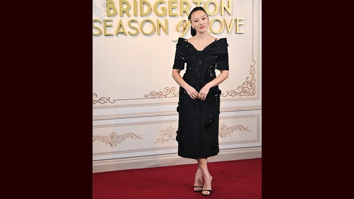 येथे ब्रिजरटन: प्रेमाचा हंगाम लंडनमधील फॅन इव्हेंटमध्ये तिने बो डिटेल आणि पीप-टो सँडलसह काळ्या एम्ब्रॉयडरी ड्रेसची निवड केली. चहाच्या लांबीच्या सिल्हूटने क्लासिक इव्हनिंगवेअरला होकार दिला, तरीही तरुणपणा जाणवत होता.